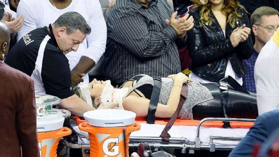 | Ellie phải nẹp cổ và băng đầu trước khi được chuyển vào bệnh viện. Ảnh: USA Today. |