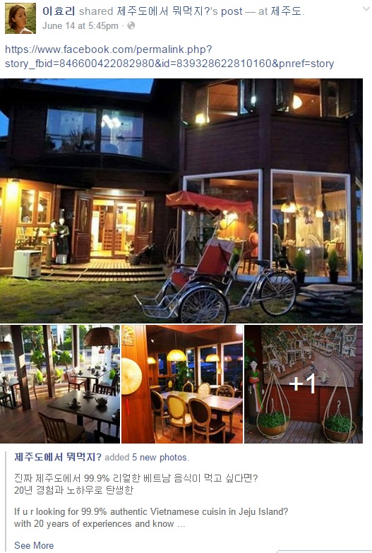 Đường link giới thiệu về nhà hàng Việt Nam tại đảo Jeju được Lee Hyori đăng 2 lần trên Facebook cá nhân, một lần vào ngày 10/6 và một lần vào ngày 14/6.