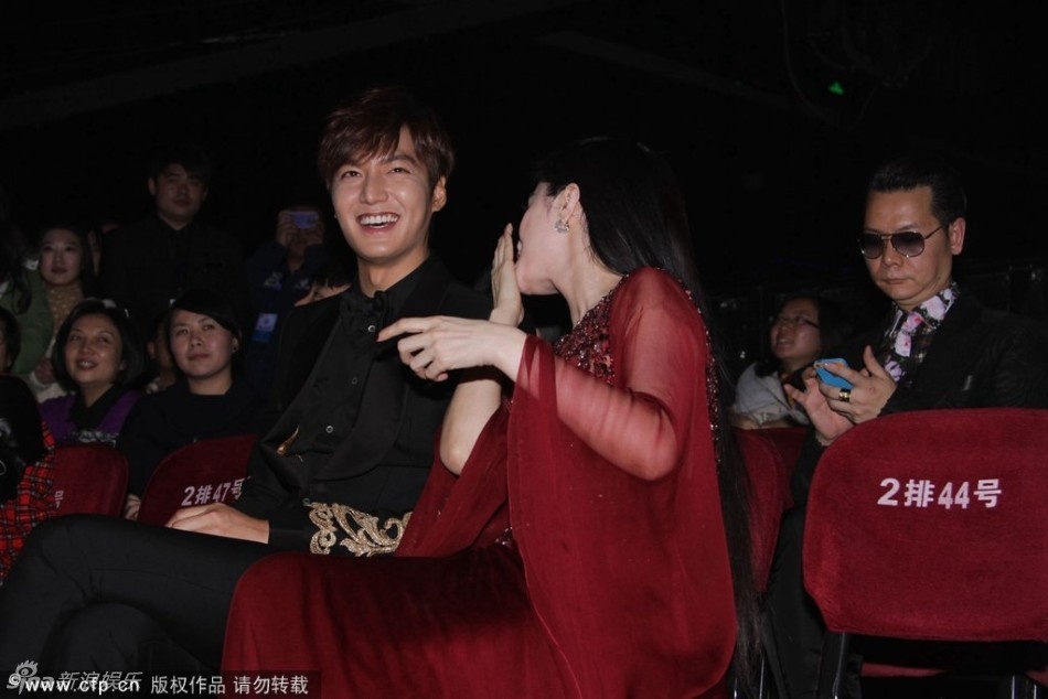 Tuy nhiên, hôm 24/3, tờ Sina tiếp tục đăng tải những hình ảnh của cặp đôi khi ngồi trên khán đài theo dõi buổi lễ. Những cử chỉ thân mật của Lee Min Ho và Phạm Băng Băng khiến khán giả mơ tới một chuyện tình chị em. Dù Phạm Băng Băng hơn Lee Min Ho 6 tuổi song cả hai trông vẫn rất đẹp đôi.
