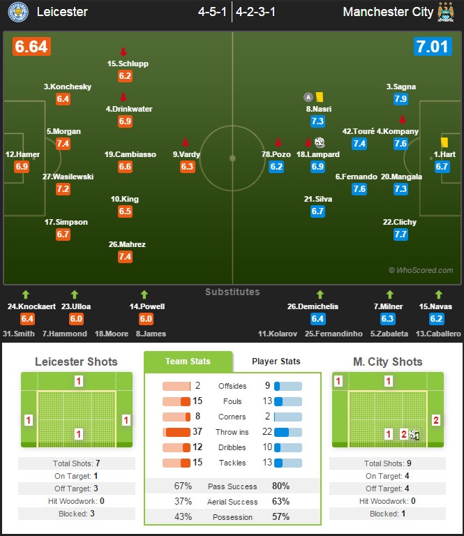 73': Cả hai đội liên tiếp có sự thay đổi người. Bên phía đội chủ nhà, Vardy rời sân nhường chỗ cho Nicky Powell - tài năng trẻ đang được M.U cho Leicester mượn. Trong khi bên phần sân đối diện, Navas vào sân thay tài năng trẻ Jose Pozo.