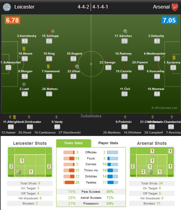 56': Nhận đường chuyền rất đẹp của Cazorla, tiền vệ Ramsey đánh đầu đưa bóng đi đúng vị trí của thủ môn Schmeichel trong tư thế không bị kèm. Đây là tình huống bỏ lỡ đáng tiếc của Ramsey.