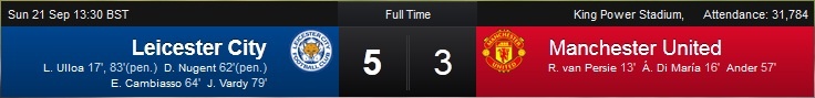Tinh thần hưng phấn sau trận đại thắng 4-0 trước QPR giúp M.U có sự khởi đầu như mơ trong chuyến làm khách trên sân của Leicester City ở vòng 5. Chỉ sau 16 phút bóng lăn, Van Persie và Di Maria đã xuyên thủng mành lưới của Kasper Schmeichel tới 2 lần.