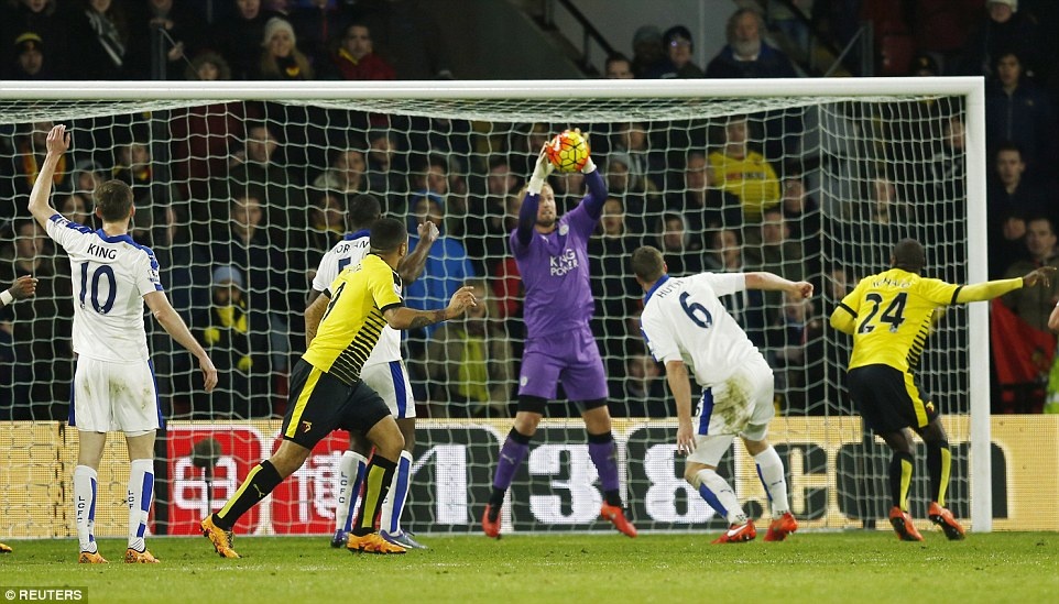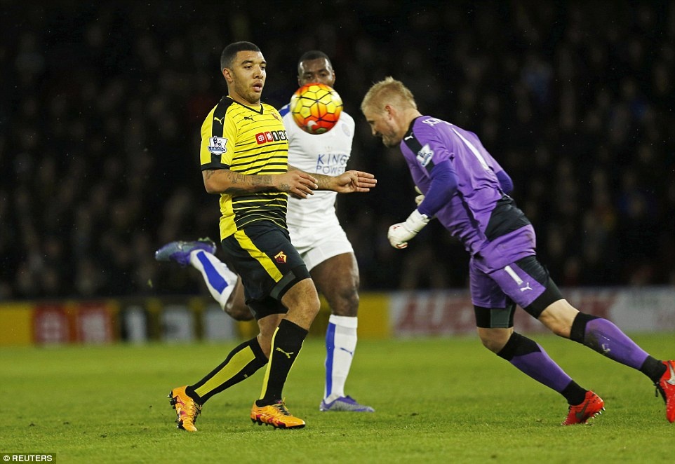 | Bên phía đội chủ nhà, tiền đạo Deeney rất đáng chú ý. Anh có tình huống đe dọa khung thành Leicester khi buộc thủ môn Kasper Schmeichel phải băng ra dùng đầu phá bóng. |