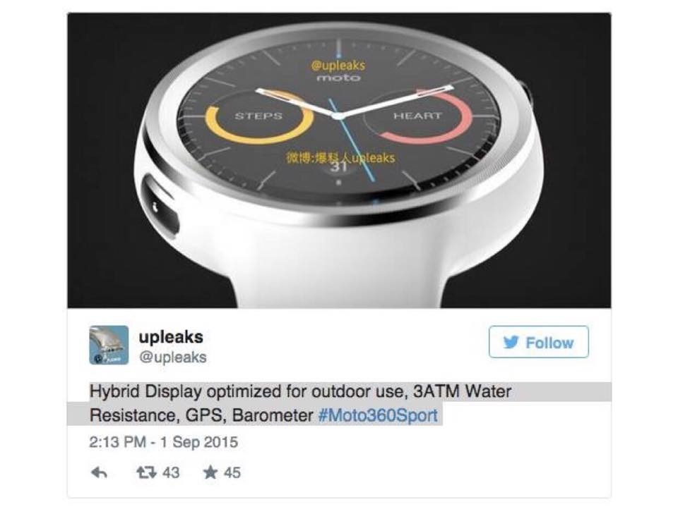 Vài giờ sau, cũng trên mạng xã hội này, tài khoản @upleaks tiếp tục hé lộ thông tin về thiết bị mới với tên Moto 360 Sport. Theo đó, tân binh mới của nhà Lenovo được trang bị công nghệ Hybrid cho phép tối ưu hoá việc hiển thị ngoài trời, khả năng chống nước 3 ATM, cảm biến đo áp suất khí quyển và định vị GPS.