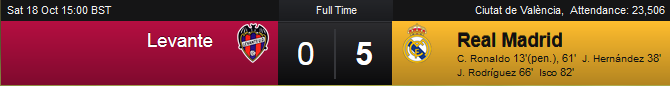 Real Madrid đã nối dài chuỗi trận thắng tại La Liga lên con số 5 sau trận thắng Levante "5 sao" ngay trên sân khách Ciutat de Valencia, trong đó có cú đúp của Ronaldo cùng 3 bàn thắng của Chicharito Hernandez, James Rodriguez và Isco. Kết quả này giúp Real tạm thời rút ngắn cách biệt xuống còn 1 điểm với Barcelona.