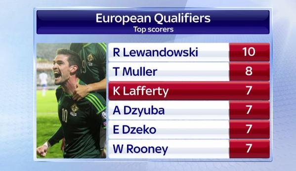 | Danh sách những chân sút hàng đầu vòng loại EURO 2016. Lewandowski (ĐT Ba Lan) dẫn đầu, tiếp đến là Thomas Mueller (Đức), và 4 cầu thủ cùng ghi 7 bàn là Kyle Lafferty (Bắc Ireland), Artyom Dzyuba (ĐT Nga), Edin Dzeko (ĐT Bosnia) và Wayne Rooney (ĐT Anh). |