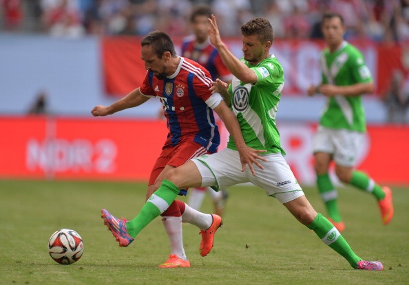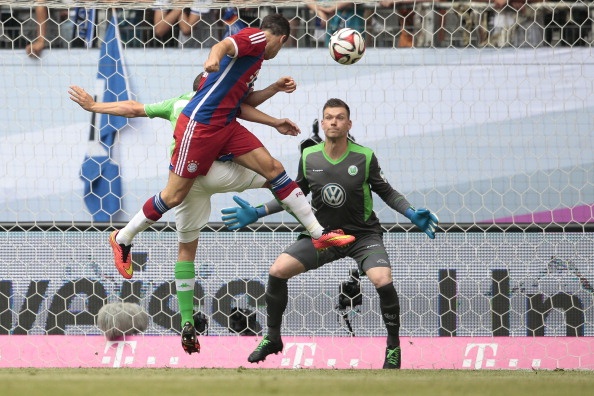 | Ngay phút thứ 4, Lewandowski sớm có pha đánh đầu tung lưới Wolfsburg sau đường chuyền như đặt của Ribery. |