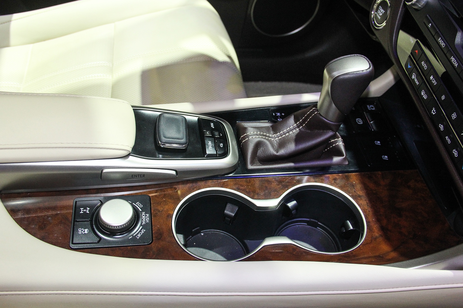 | Vị trí cần số đặt gần hơn với người lái, tăng thêm sự tiện dụng. RX 350 2016 có 3 chế độ lái khác nhau, có thể chọn qua nút xoay. |