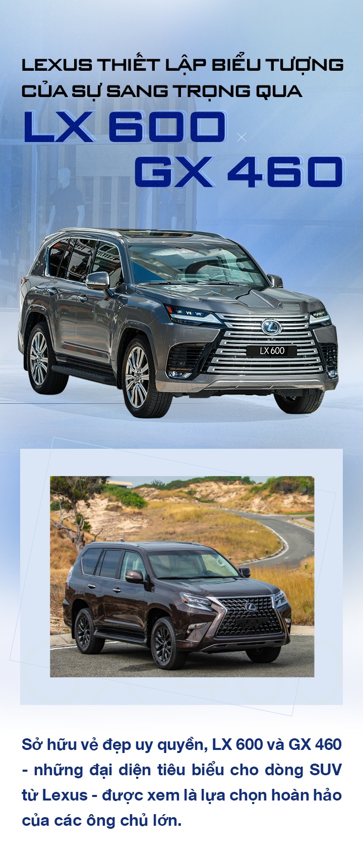 Đó là điểm khởi đầu cho sự ra đời của Lexus. Trải qua 39 năm xây dựng và phát triển, Lexus đã trở thành thương hiệu gắn liền với sự sang trọng và đẳng cấp. Dòng SUV của hãng, mới nhất là LX 600 và GX 460, thiết lập nên những tiêu chuẩn mới cho xe sang và đánh thẳng vào phân khúc khách hàng là các ông chủ lớn.
