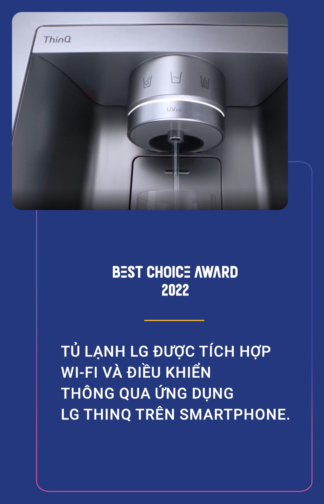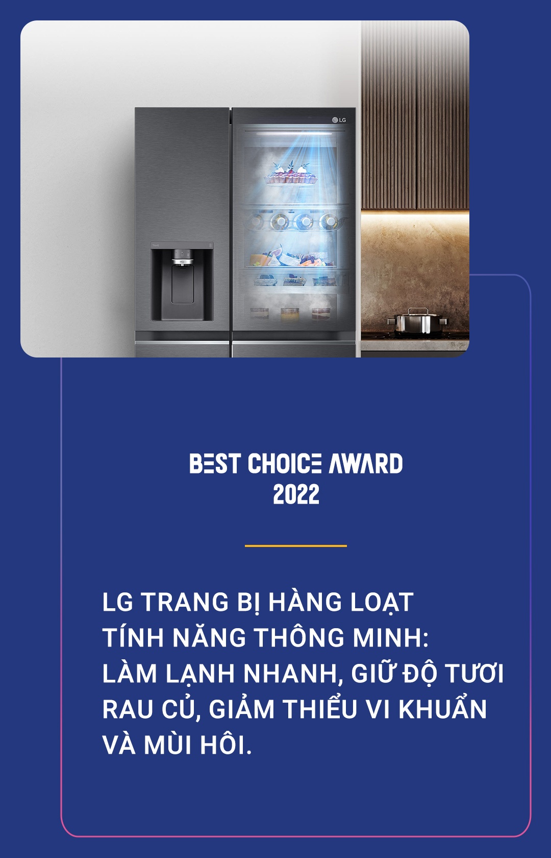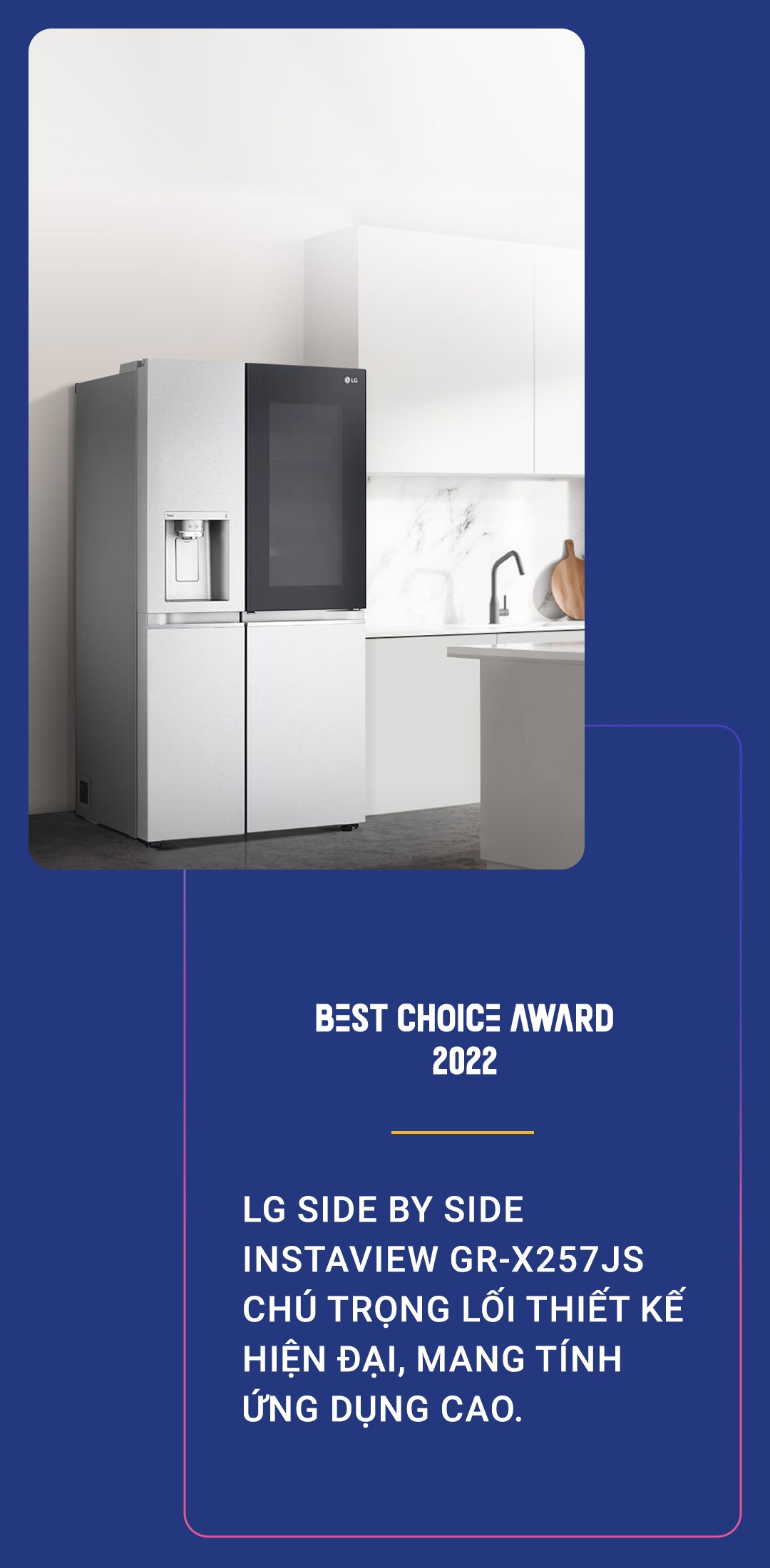 Sau nhiều ngày bình chọn tại Best Choice Award 2022, chiến thắng tại hạng mục tủ lạnh đã thuộc về LG Side by Side InstaView GR-X257JS với 37,57% người dùng bình chọn. Ở các vị trí còn lại là Hitachi R-WB640VGV0 (27,62%), Samsung Side by Side 635L (20,44%), Panasonic PRIME+ Edition NR-CW530XMMV (14,36%).