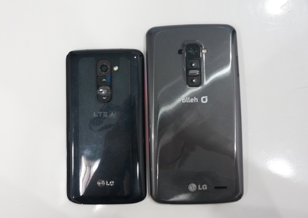 | Các phím vật lý ở mặt sau được bố trí giống nhau, nhưng G Flex có thêm một cổng hồng ngoại đối xứng với đèn Flash qua Camera. |