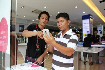 | Một khách hàng đang trải nghiệm LG G2 tại cửa hàng Mai Nguyên. |