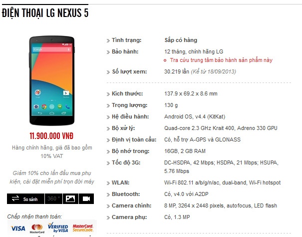 Trong năm 2013, các sản phẩm chính hãng thuộc dạng “bom tấn” của LG đều được đưa về Việt Nam rất nhanh sau khi bán ra tại thị trường quốc tế, khác hẳn với năm ngoái. LG Nexus 5 – chiếc điện thoại đầu tiên chạy Android 4.4 KitKat sẽ được bán ra ngay trong tuần này với giá chính hãng là 11,9 triệu đồng cho bản 16 GB.