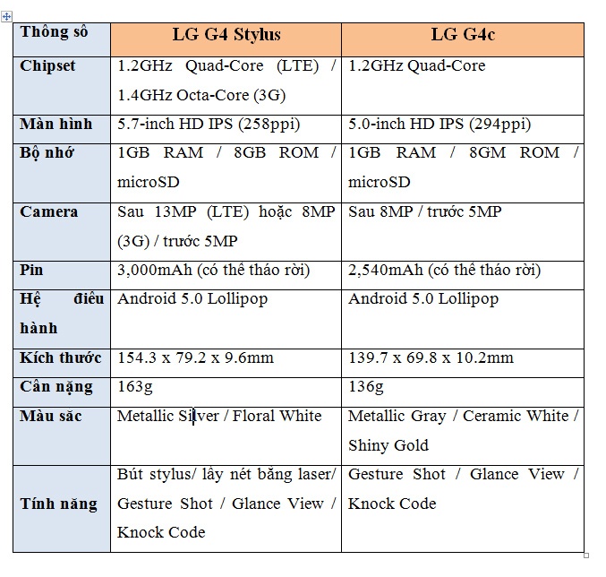 LG G4 Stylus là phablet 5,7 inch, lớn hơn so với LG G4. Giống như tên gọi, máy trang bị bút cảm ứng Stylus Rubberdium, cho phép ghi chú hoặc vẽ dễ dàng trên màn hình khổ lớn. Phiên bản màn hình nhỏ - G4c – cung cấp nhiều tính năng cao cấp của G4 nhưng trong bộ khung nhỏ hơn.