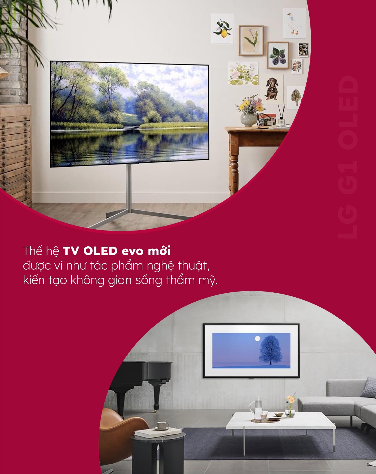 Đầu tiên, TV không chỉ là thiết bị giải trí đơn thuần. Với nhiều căn hộ cao cấp, TV còn đóng vai trò là nội thất trang trí cho ngôi nhà. Ngoài thiết kế siêu mỏng nhờ tấm nền OLED, thế hệ TV mới của hãng còn có chế độ triển lãm nghệ thuật, biến TV thành bức tranh khi không dùng đến. LG cũng cung cấp chân đế cho phép đặt chiếc OLED TV ở bất kỳ vị trí nào trong nhà.