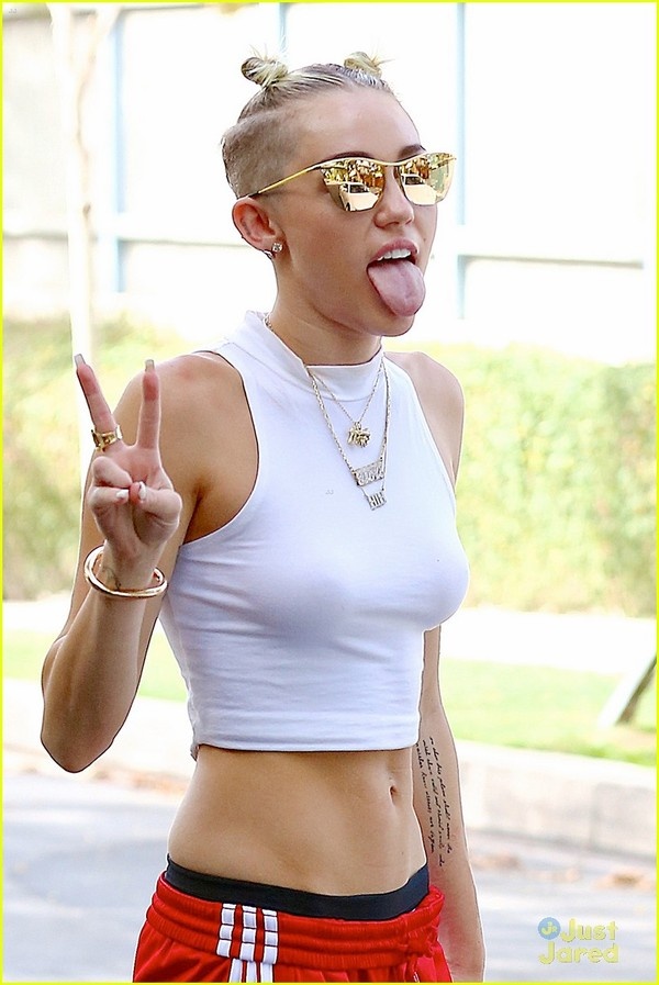 Trong khi đó, Miley Cyrus thì vừa được trông thấy ở California. Nữ ca sỹ rời khỏi một nhà hàng trong chiếc áo mỏng không nội y. Cô lên tục tạo dáng bằng cách lè lưỡi khi trông thấy ống kính máy ảnh.