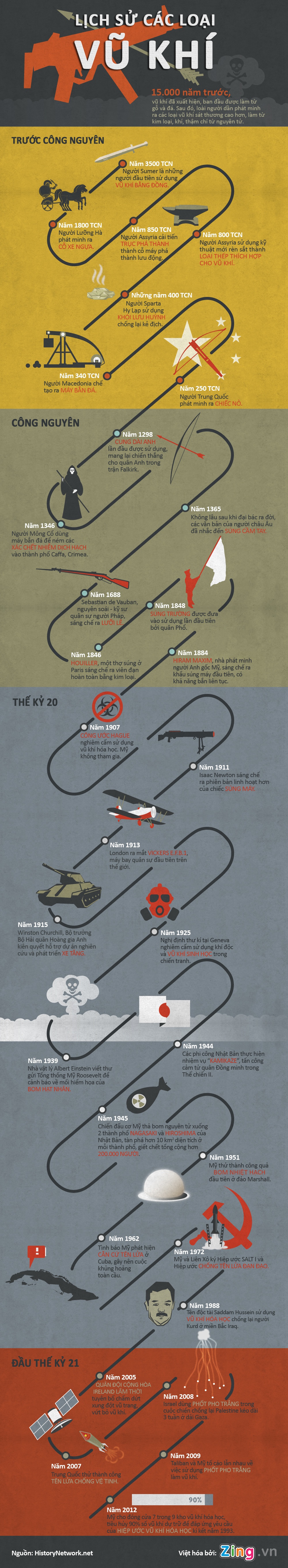 Vũ khí đã xuất hiện từ xa xưa, ban đầu làm từ gỗ và đá thô sơ, sau dần phát triển thành các loại vũ khí sát thương cao hơn như súng, thậm chí là bom nguyên tử.