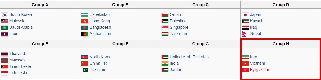 | Đội Olympic Việt Nam nằm ở bảng H cùng Iran và Kyrgyzstan. |