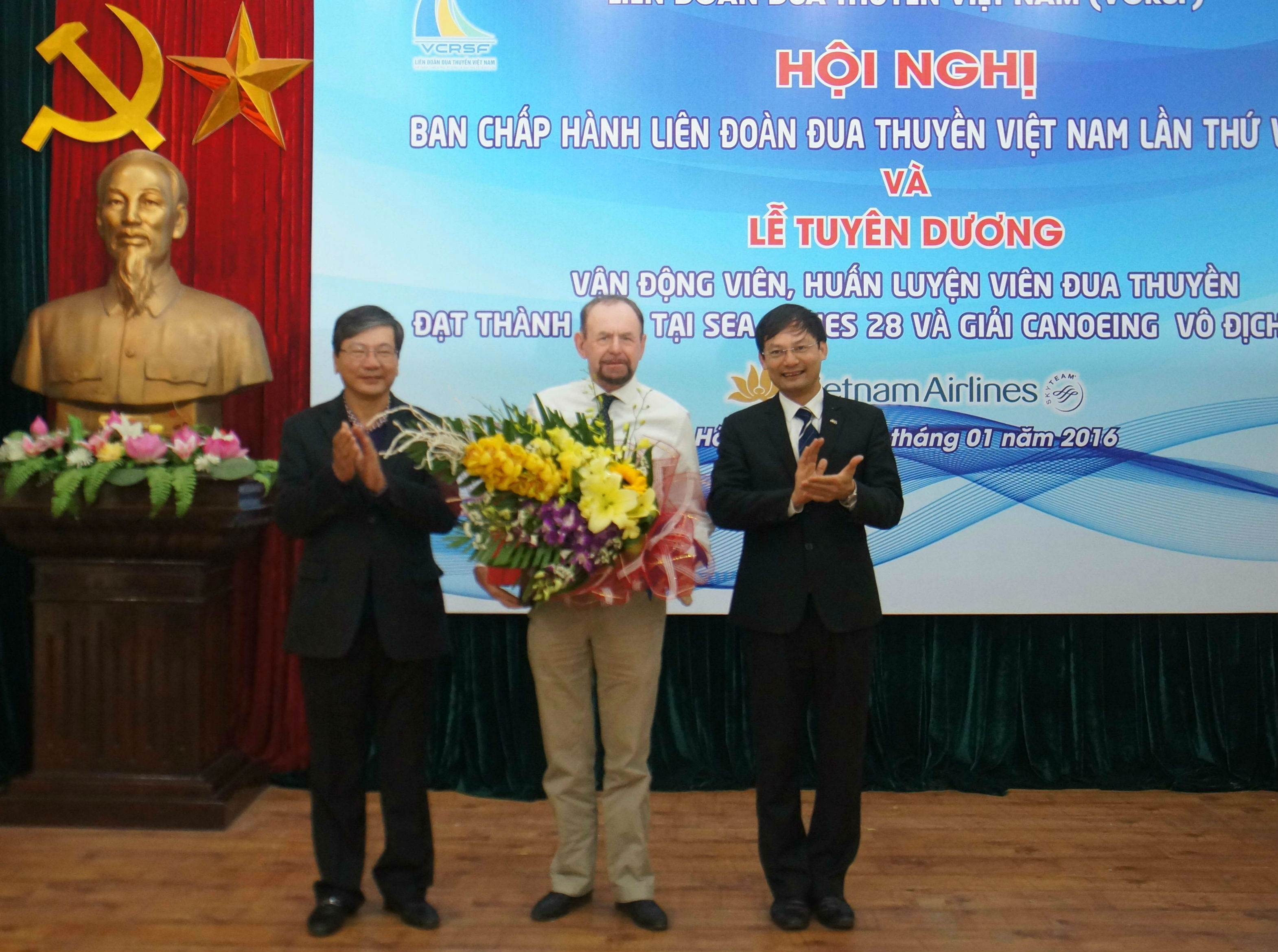 | Chủ tịch Liên đoàn Đua thuyền Việt Nam Phạm Ngọc Minh (trái) và Tổng thư ký Nguyễn Hải Đường trao thưởng cho chuyên gia Joseph Donnelly. |