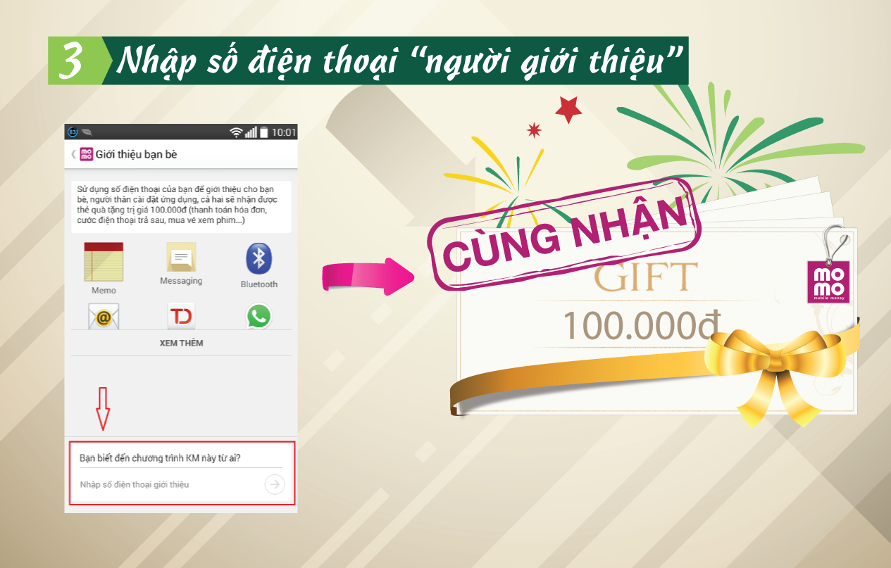 Điều kiện để người được giới thiệu nhận thẻ quà tặng là đăng ký Ví MoMo, liên kết với tài khoản ngân hàng Vietcombank và thực hiện một giao dịch có nguồn tiền từ ngân hàng VCB đã liên kết và điền số điện thoại của người giới thiệu vào tính tính năng “Giới thiệu bạn bè” trên ứng dụng. Theo đó, khi người được giới thiệu sử dụng thẻ quà tặng này người giới thiệu sẽ nhận được ngay thẻ quà tặng có giá trị 100.000 đồng.