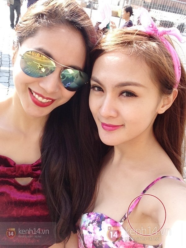 | Trong chuyến đi Nga cùng Khả Ngân, Tâm Tít và các hot girl, sao Việt, Kelly cũng lại "hớ hênh" trong lúc chụp hình với ca sĩ Thủy Tiên. |
