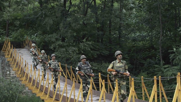| Một nhóm lính biên phòng Ấn Độ tuần tra gần Đường kiểm soát biên giới trong khu vực Kashmir. Ảnh: Reuters. |
