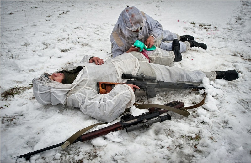 Xạ thủ vùi thân dưới tuyết nhờ sự giúp đỡ của đồng đội. Nòng súng và ống ngắm quang học lộ ra ngoài giúp họ theo dõi và bắn hạ mục tiêu trong khi kẻ địch hoàn toàn bất ngờ. |