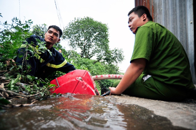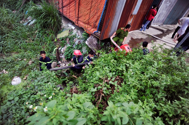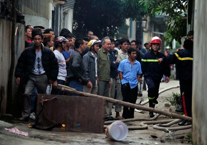 | Vì ngõ nhỏ khó cho xe chữa cháy vào nên phải dùng nước ao gần đó. |