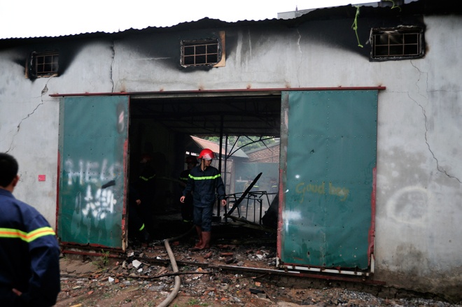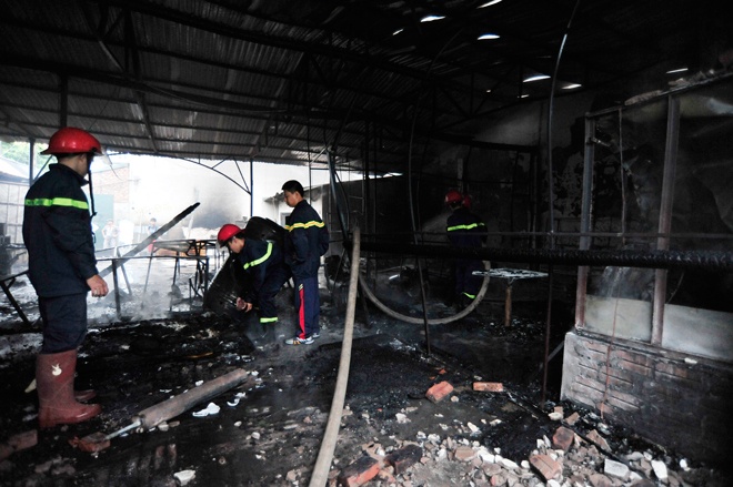 | Lực lượng cảnh sát PCCC khá vất vả vì trong xưởng còn rất nhiều sơn. |