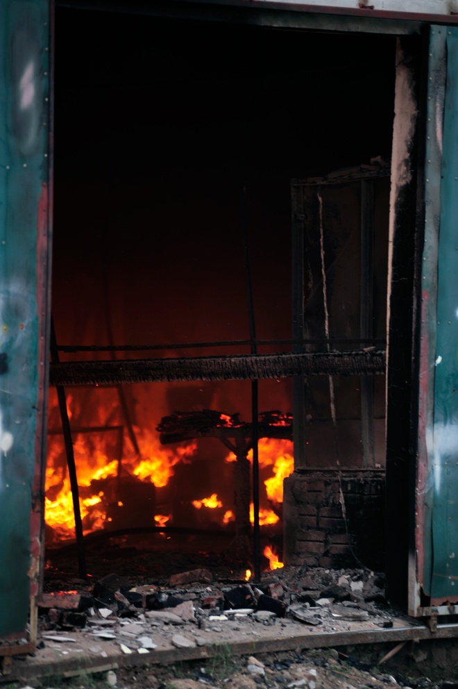 | Đám cháy đã thiêu rụi hoàn toàn số lượng gỗ và thiết bị trong xưởng. |