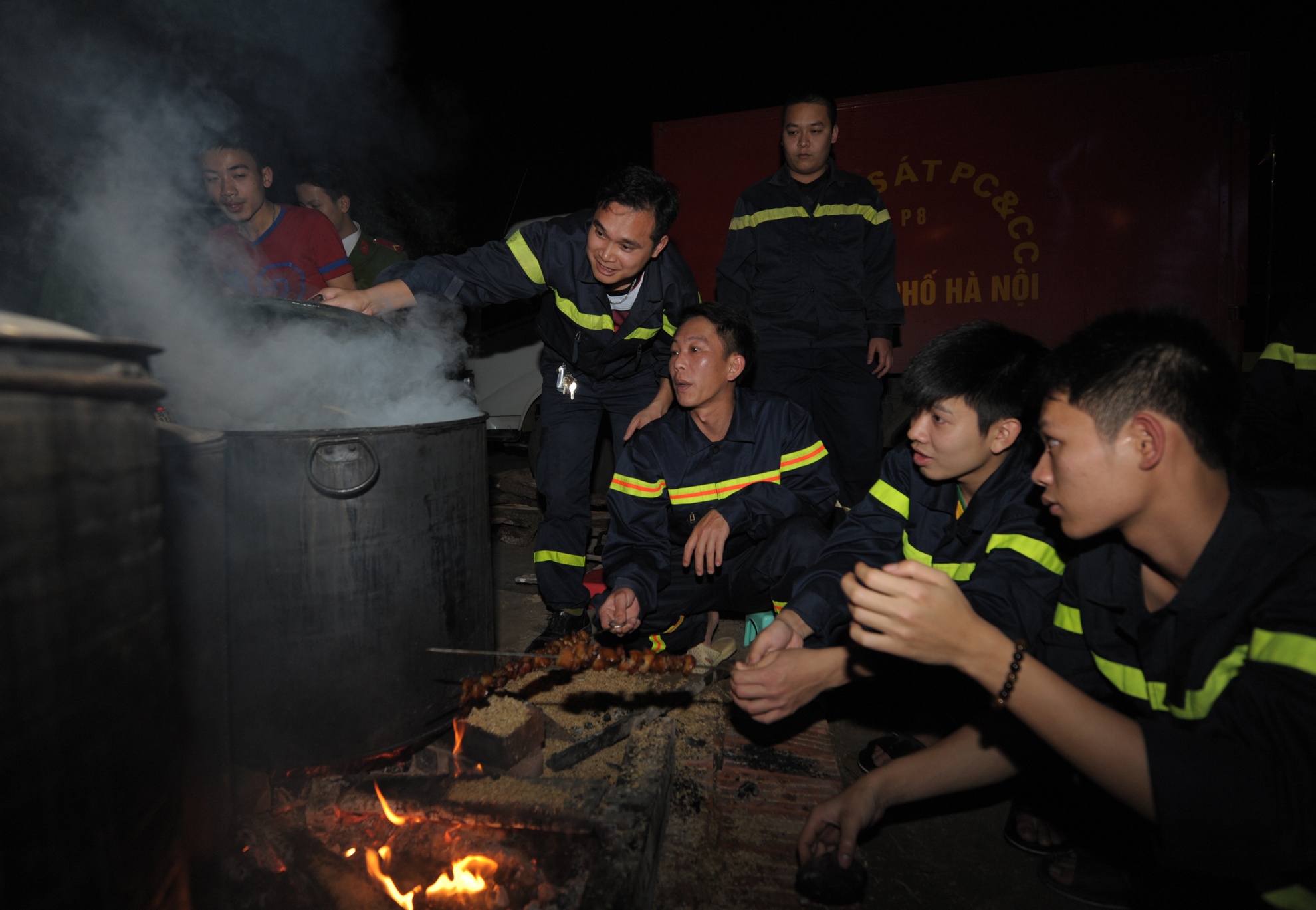 | 1h sáng 17/2 (29 Tết), toàn bộ cán bộ, chiến sĩ lại quây quần bên nồi bánh chưng, nướng thịt, khoai lang trong tinh thần trực chiến cao độ đảm bảo an toàn cháy nổ cho người dân. |