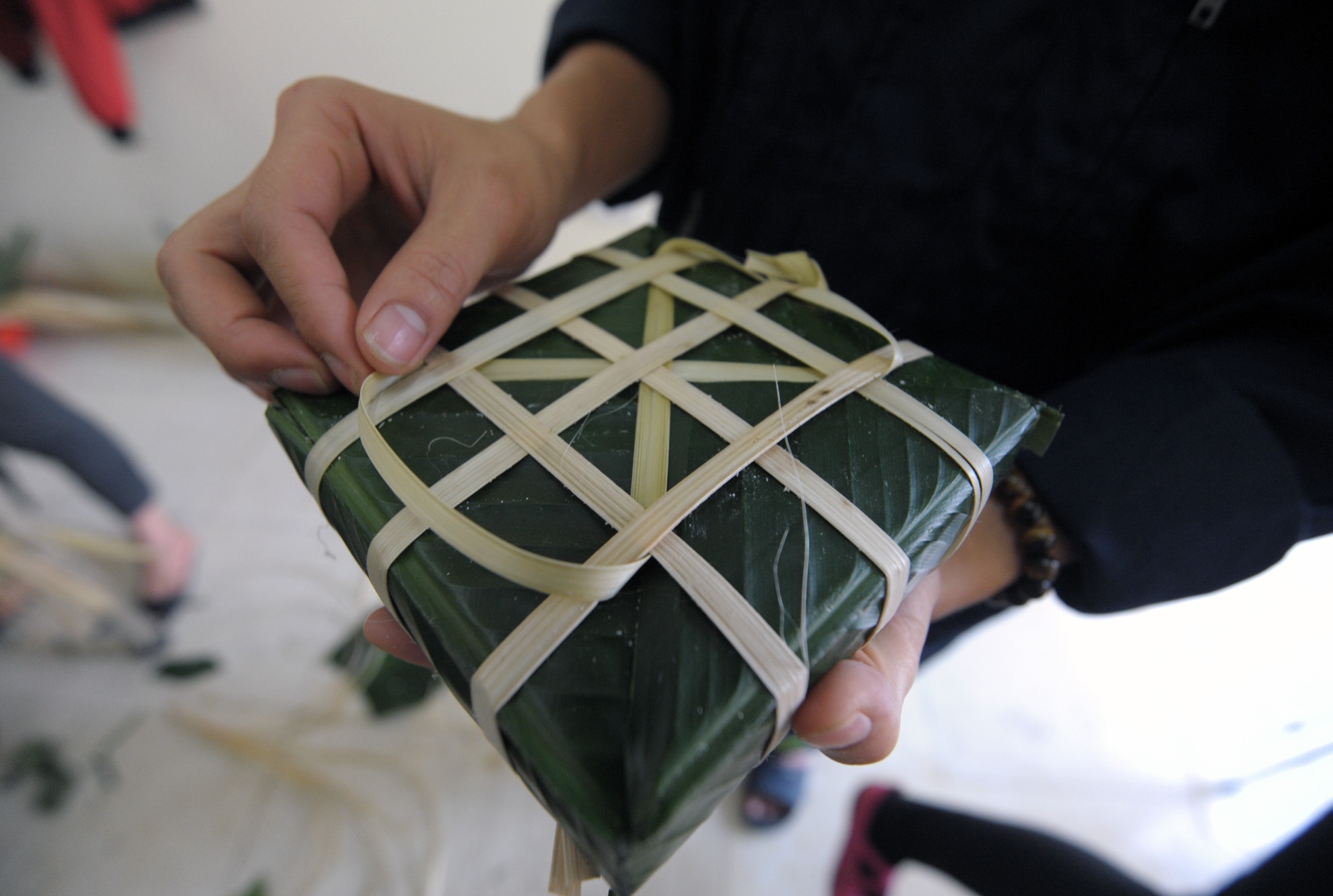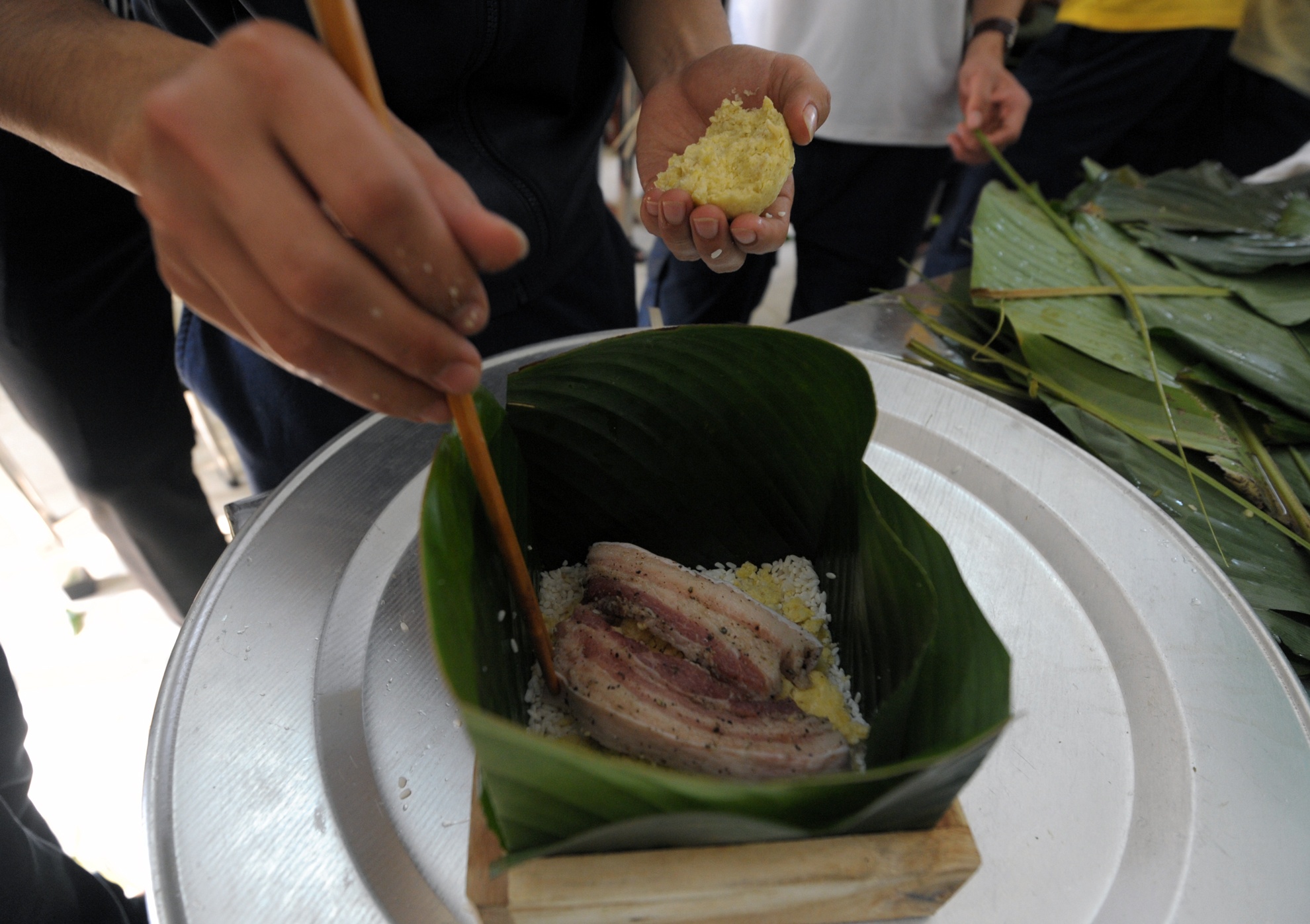 | Phạm Đức Duy (quê Sơn Tây, Hà Nội) lại thích gói bánh tét để cho độc đáo và cũng dễ nhận ra sau khi luộc. |