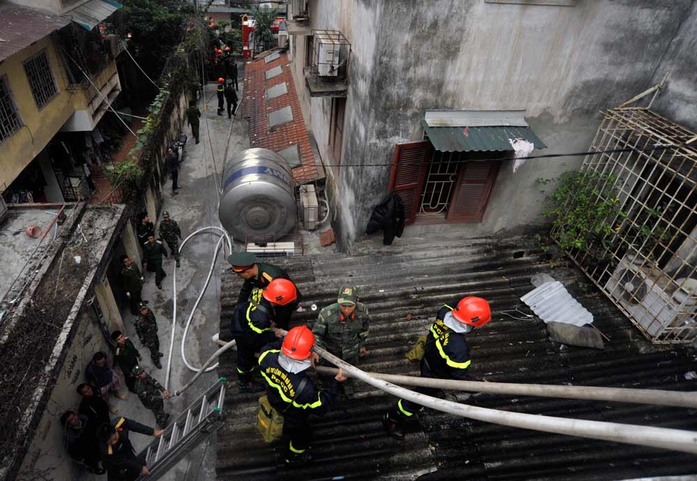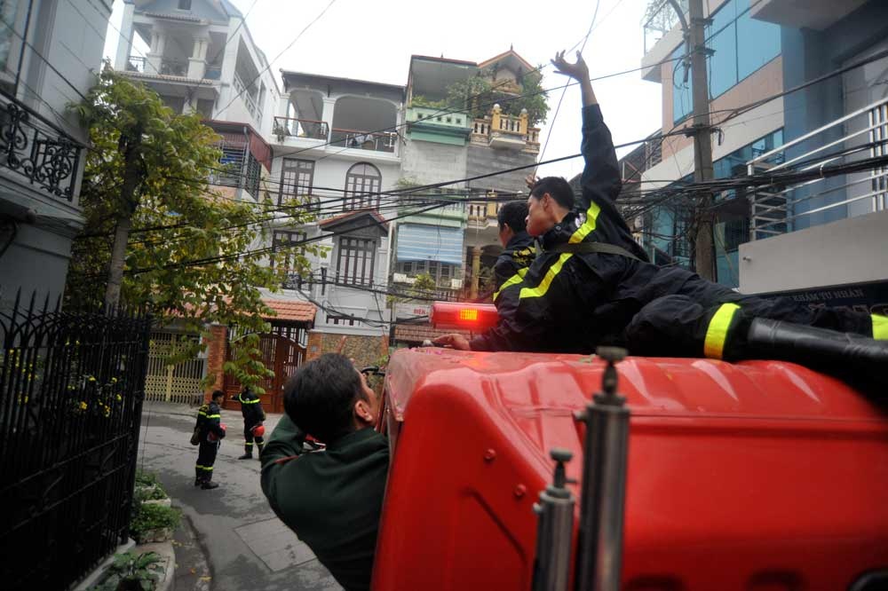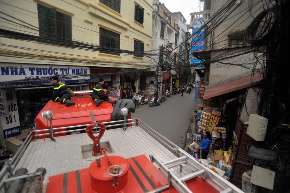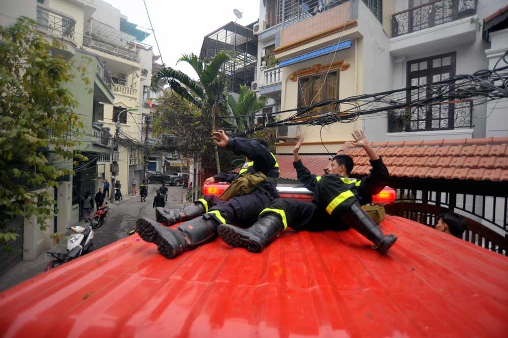 Trên nóc xe chữa cháy của BTL Thủ Đô, 2 chiến sĩ phải căng mình để nâng cáp cho xe di chuyển. Ở phía dưới, các chiến sĩ khác phải dẹp đường ngăn xe cộ cản trở để xe có thể len qua những con phố nhỏ.