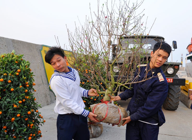 Hai chiến sĩ trẻ phấn khởi với cây đào, quất còn xanh lá chuẩn bị cho việc trang trí đơn vị.