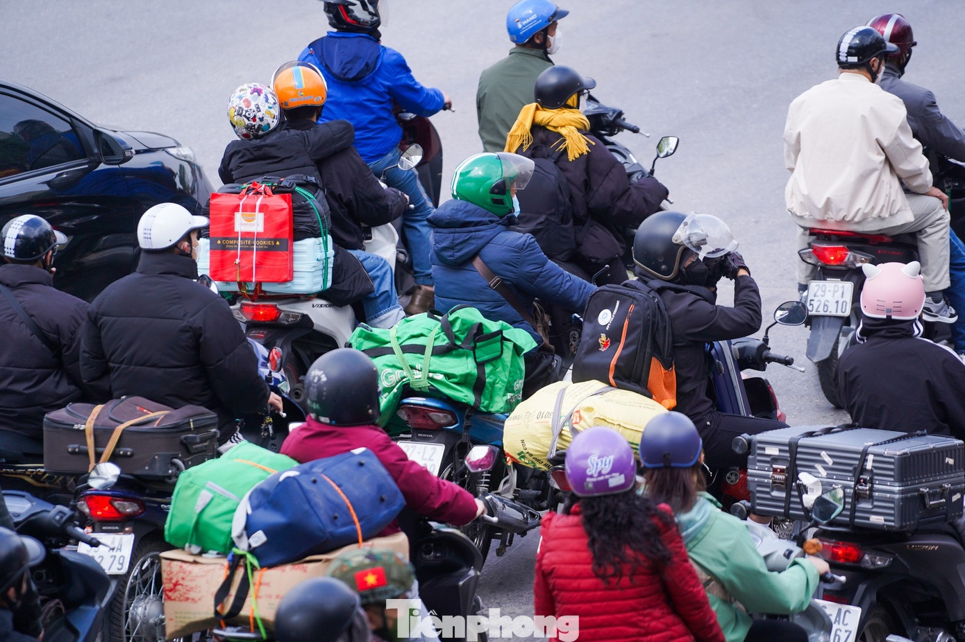 Phía sau những chuyến xe hối hả hướng về Thủ đô là lỉnh kỉnh đồ đạc, bó rau, túi quà quê... được khệ nệ mang theo, tạo nên hình ảnh quen thuộc trên đường phố những ngày đầu năm.