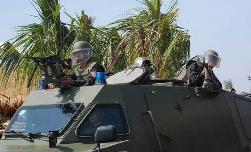 Buổi sáng, các lực lượng vũ trang thực binh diễn tập giải cứu con tin trên tàu du lịch, sơ tán cơ động một bộ phận cơ quan Đảng, Nhà nước, lực lượng vũ trang và nhiều ban ngành đến nơi tập trung bí mật. Đồng thời đánh chiếm mục tiêu của địch. Trong ảnh: Xe đặc chủng của lực lượng vũ trang được điều động.