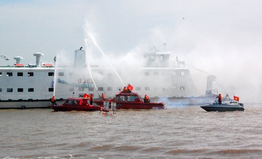 Đợt diễn tập lần này ở thành phố Cần Thơ diễn ra từ ngày 2-4/12, vận hành theo cơ chế 3 cấp thành phố, quận, huyện và cấp xã, phường, thị trấn gắn liền với diễn tập thực binh. Trong ảnh: Tàu thuyền, ca nô lướt trình diễn trên sông Cần Thơ.
