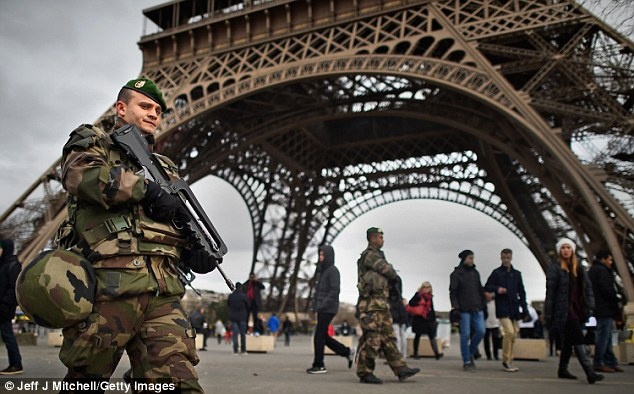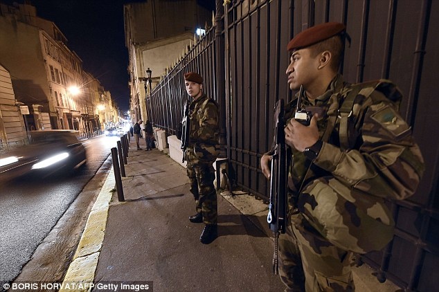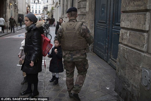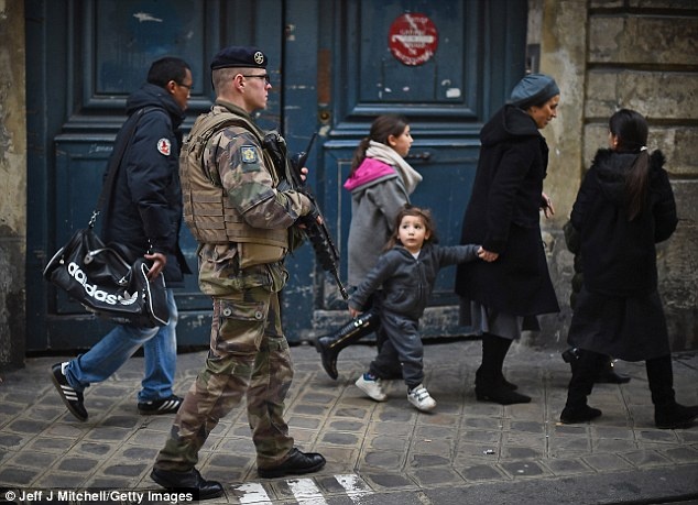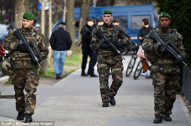 Binh lính vũ trang được tăng cường sau khi cảnh sát cho biết, họ phát hiện tấm bản đồ đánh dấu vị trí của các trường học Do Thái ở thủ đô Paris từ xác một kẻ khủng bố. Ảnh: AFP |