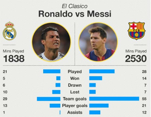 | Đóng góp của Messi cho Barca trong các trận siêu kinh điển lớn hơn rất nhiều những gì Ronaldo mang lại cho Real. |