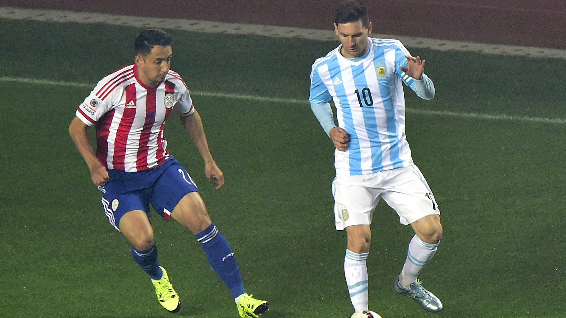 | Lionel Messi (phải) không ghi bàn vào lưới ĐT Paraguay, nhưng vẫn được đánh giá là cầu thủ thi đấu ấn tượng nhất trận. Ảnh: Goal. |