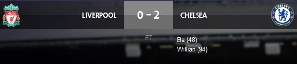 Kết thúc trận đấu, Chelsea đánh bại Liverpool với tỷ số 2-0.