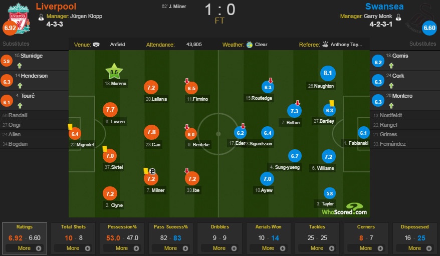 Giành chiến thắng tối thiểu 1-0, Liverpool vươn lên vị trí thứ 6 với 23 điểm và chỉ còn cách vị trí thứ 4 của Arsenal 4 điểm và ngôi đầu của Man City 6 điểm. Trong khi Swansea vẫn tiếp tục chìm sâu vào cuộc khủng hoảng và vẫn dậm chân ở vị trí thứ 15.