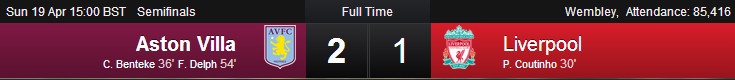 Về phần mình, khả năng tấn công thiếu đột biến khiến Liverpool bất lực trong việc tìm đường vào khung thành của thủ môn Shay Given. Thua ngược 1-2, The Kop lỡ cơ hội tạo nên trận chung kết đỉnh cao với Arsenal đúng vào ngày sinh nhật của Steven Gerrard. Một cái kết hơi đáng tiếc khi G8 sẽ chia tay sân Anfield cuối mùa giải năm nay.