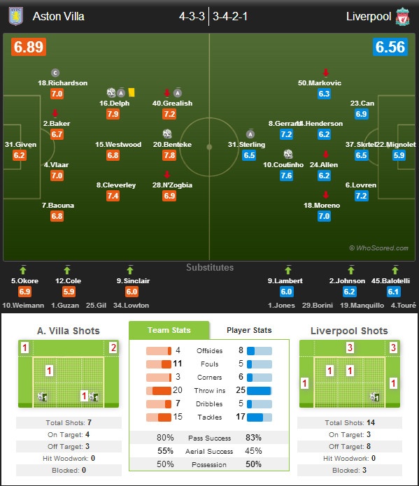 87': Từ pha đá phạt góc của Coutinho, Gerrard bật cao đánh đầu đưa bóng vào góc xa nhưng hậu vệ Richardson đã cứu thua ngay trên vạch vôi cho Aston Villa.