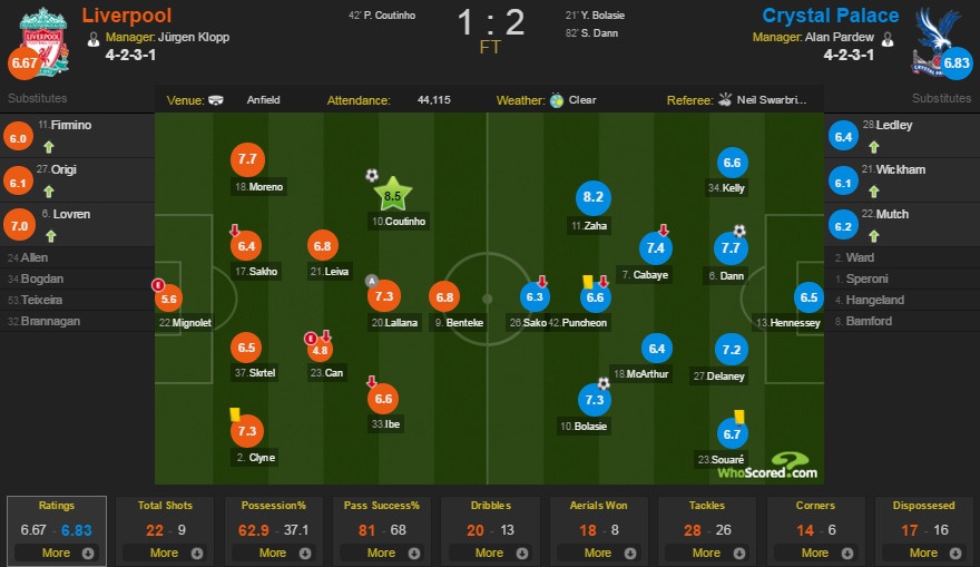 Dẫu vậy, bàn thắng ấn định chiến thắng 2-1 của Palace lại xuất phát từ tình huống cố định. Trong nỗ lực lên tham gia tấn công ở phút 82, trung vệ Scott Dann thực hiện liên tiếp 2 pha đánh đầu khiến thủ thành Mignolet không kịp trở tay.