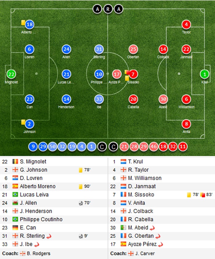 | Khi trận đấu còn 7 phút, trọng tài Lee Mason truất quyền thi đấu của Moussa Sissoko do nhận hai thẻ vàng. |