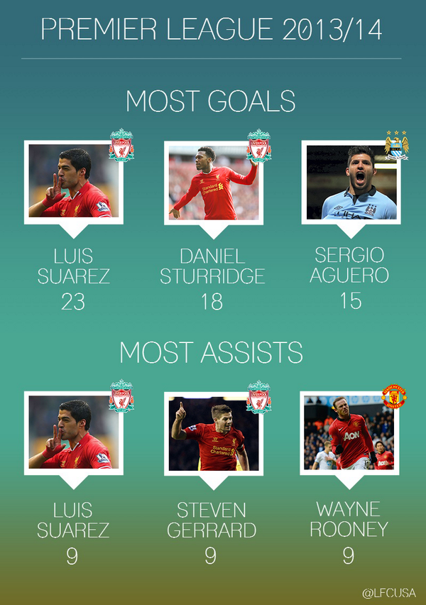 Trên danh sách những cầu thủ có nhiều pha kiến tạo nhất tính đến hết vòng 27, Liverpool tiếp tục gây chú ý với 2 cầu thủ dẫn đầu gồm Steven Gerrard và Luis Suarez. Hai ngôi sao của Liverpool cùng Wayne Rooney (M.U) đã có 9 đường chuyền giúp đồng đội lập công.