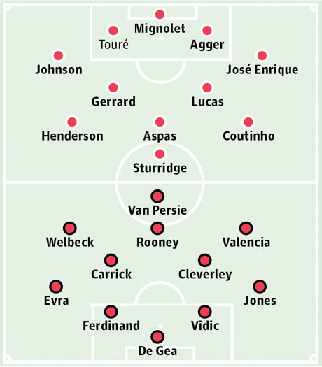 | Đội hình dự kiến của Liverpool và MU (Toure không chắc chắn ra sân do chấn thương). |