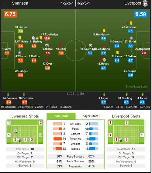 Khi trận đấu còn 10 phút, nhằm tạo ra sự đột biến cho những pha tấn công của Liverpool, HLV Rodgers quyết định đưa Sterling vào thay Victor Moses. Tuy nhiên, đội khách không thể xuyên thủng mành lưới của Swansea thêm một lần nữa. Trận hòa 2-2 trên sân Liberty giúp Quỷ đỏ vùng Merseyside trở lại ngôi đầu bảng với 10 điểm sau 4 vòng đấu (thắng 3, hòa 1).