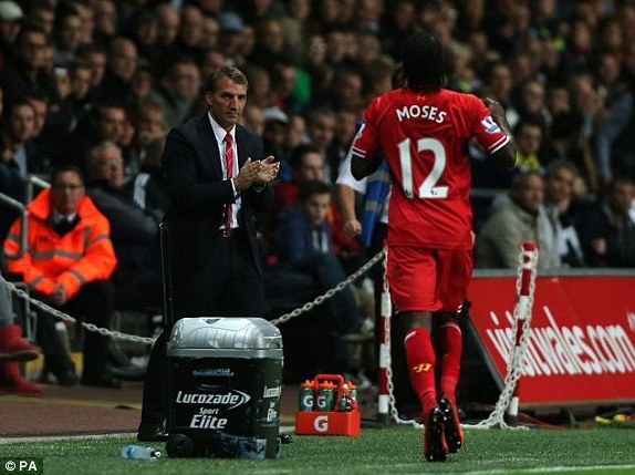 | Moses ghi bàn cho Liverpool trong trận gặp Swansea. |